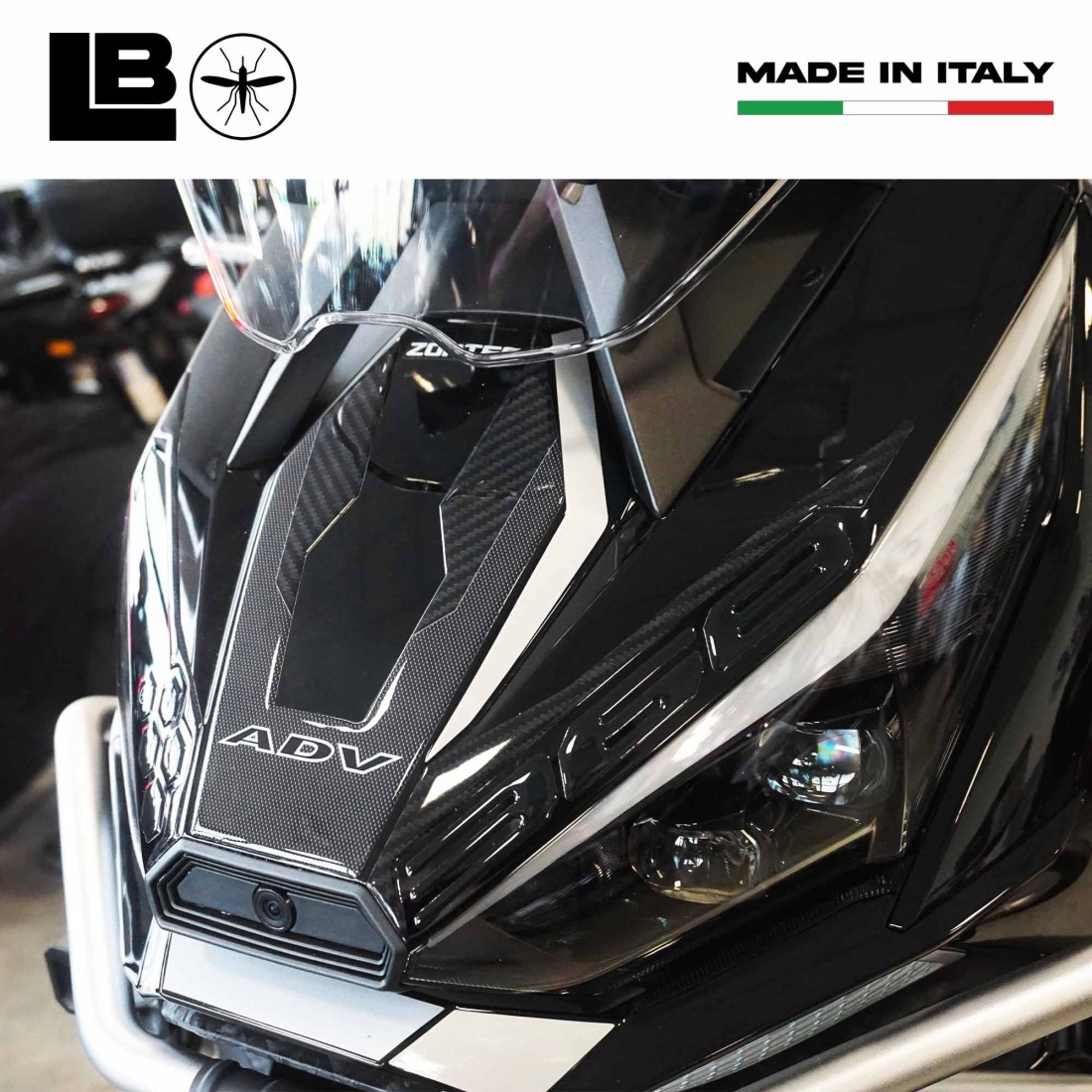 Adhesivo de resina Made in Italy, Exclusivo Labelbike. Hecho de resina con gráficos efecto Carboinio y letras ADV. Nuestros adhesivos decoran y hacen único tu scooter, lo protegen de golpes y arañazos y resisten a la intemperie y a los rayos UV.