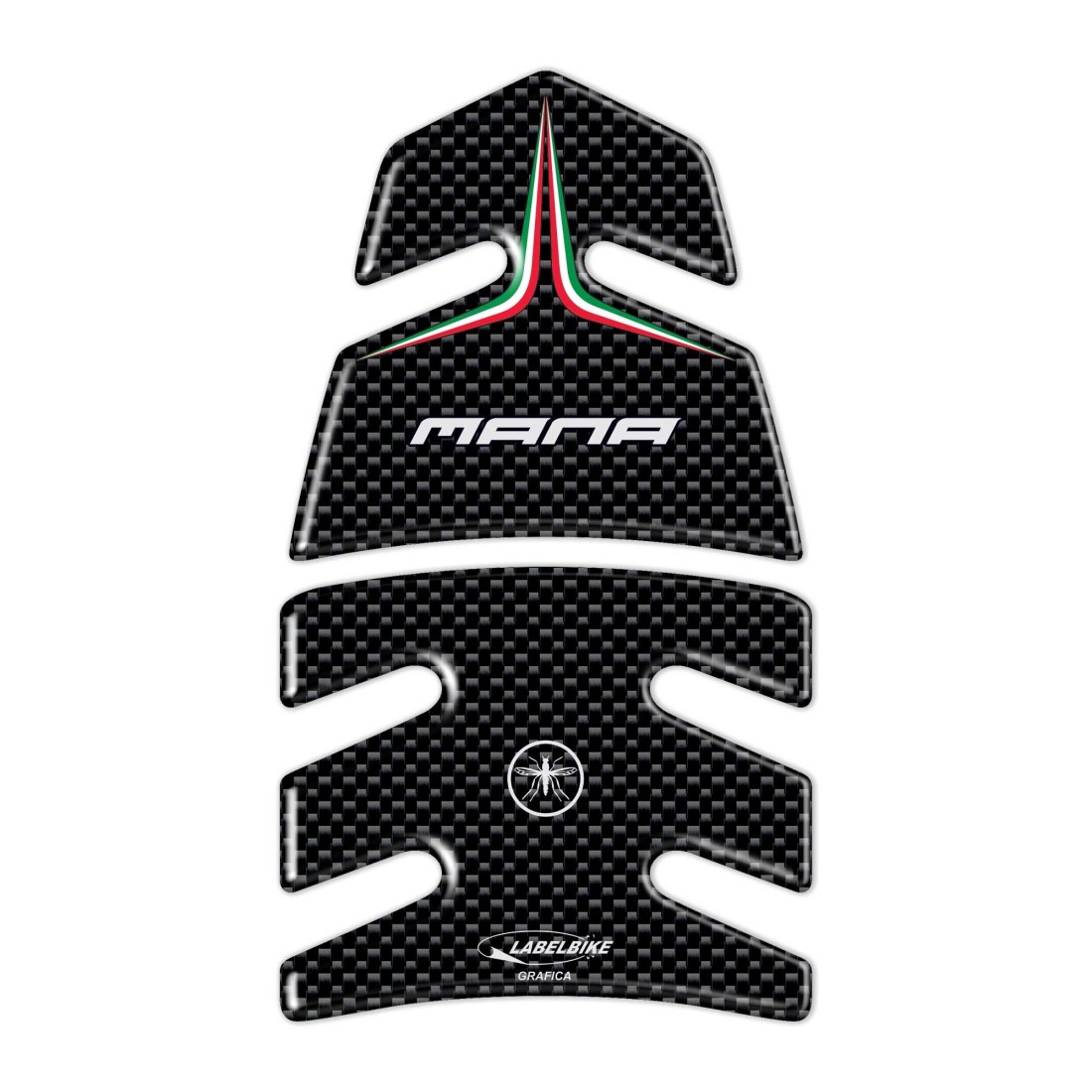 Protector de depósito adhesivo de resina para moto Aprilia Mana. Tamaño: 10 x 18 cm. Exclusivo - Labelbike. Adhesivo para depósito HECHO EN ITALIA Realizado en resina con efecto 3D. Gráficos Simil Carbon escritos Mana en gris claro. Repara el depósito de tu moto de golpes y arañazos, resiste a la intemperie y a los rayos UV.