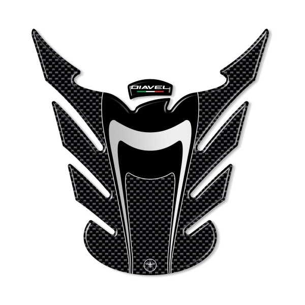 Protector de depósito en RESINA 3D Compatible para MOTO Ducati Protector de depósito "DUCATI DIAVEL" Tamaño: para depósito DIAVEL Protector de depósito en aspecto fibra de carbono con escrituras y acabado gris metalizado.