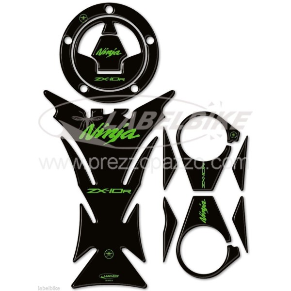 El kit se compone de: Protector de Depósito - Protector de Tapón de Depósito - Protector de Tapón de Combustible Protector de Placa de Horquilla - Protector de Placa de Dirección COLOR INFERIOR NEGRO y ESCRITURA VERDE Repara de golpes y arañazos Resistente a la intemperie y a los rayos UV.