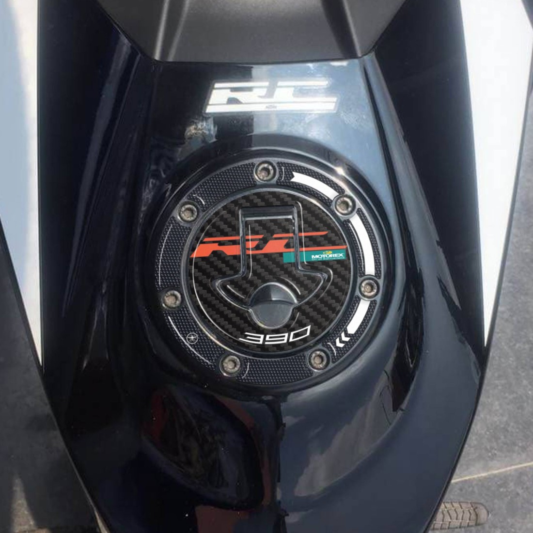 Protección adhesiva de resina para tapa de depósito de KTM 390 de 2015 a 2020. Adhesivo de resina de gel 3D Exclusivo - Labelbike®. Protector adhesivo para el tapón del depósito HECHO EN ITALIA Realizado en resina con efecto 3D. Gráficos con base Carbon Look (efecto carbono) y escritura RC 390.