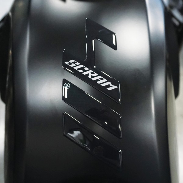 Protector de depósito de moto realizado en resina de gel 3D sobre material metálico. Protector de depósito de moto con gráfico base negro y letras SCRAM efecto metálico plateado.