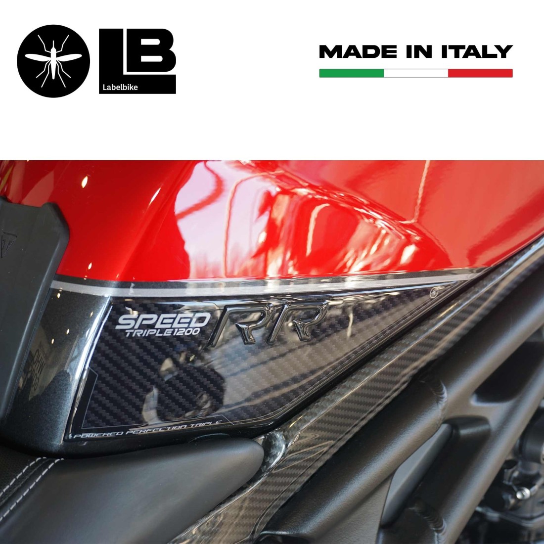 Adhesivos para moto HECHO EN ITALIA Realizados en material metalizado con efecto 3D. Gráficos en Carbon Look (efecto carbono) con letras Silver y Speed Triple 1200 RR.
