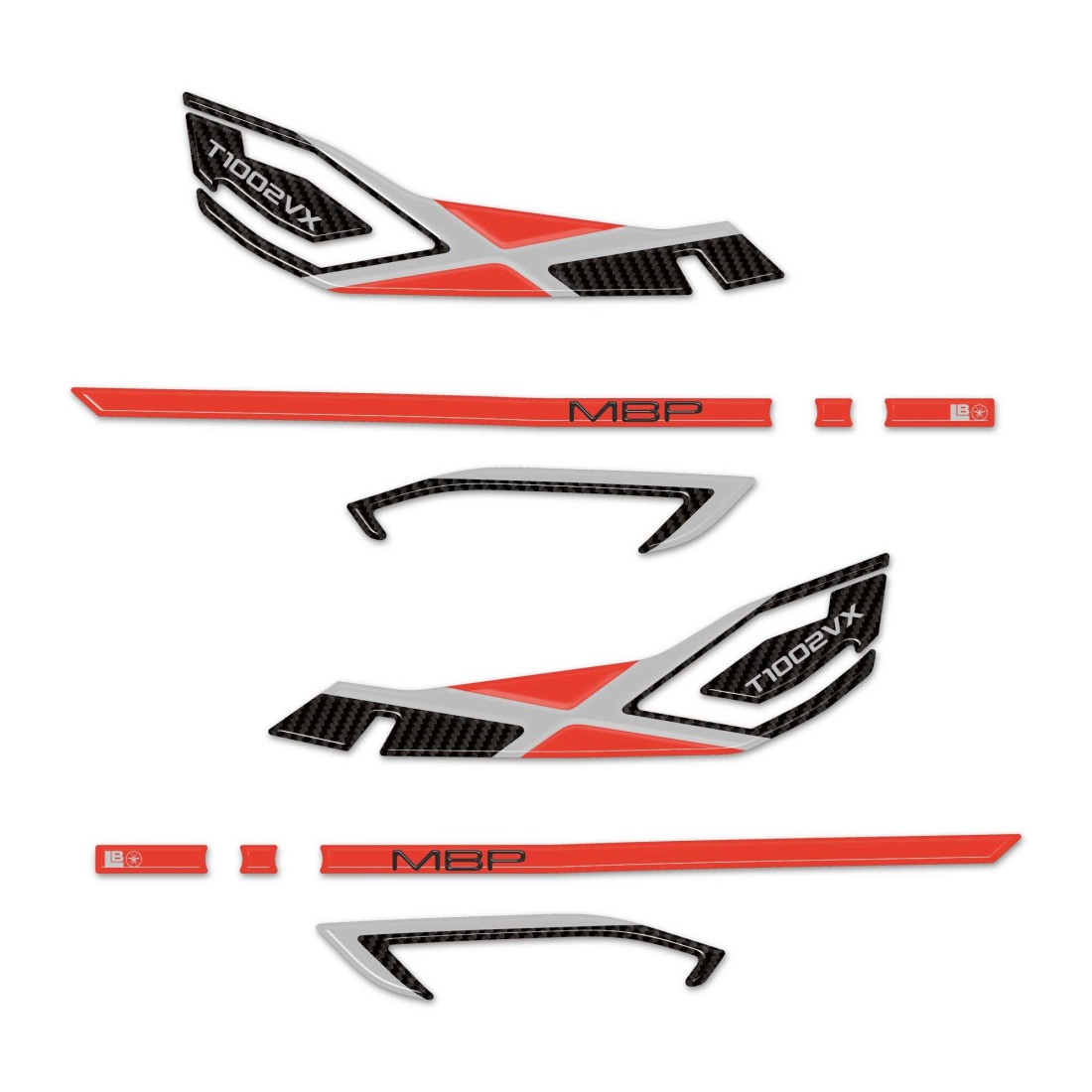 Adhesivos para guardamanos delanteros de moto fabricados en resina con efecto 3D. Para nuestros protectores de manos adhesivos hemos creado un gráfico recubierto de resina en un solo color que es compatible con los dos colores de la moto. Protectores adhesivos de resina para guardamanos de moto con gráfica roja y letras 1002. Par de adhesivos para guardamanos de moto derecho e izquierdo compatibles con Morbidelli T1002VX 2025.