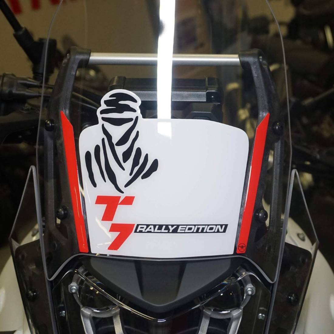 Adhesivo con gráficos a juego con la coloración de la moto. Escritos EDICIÓN RALLY.