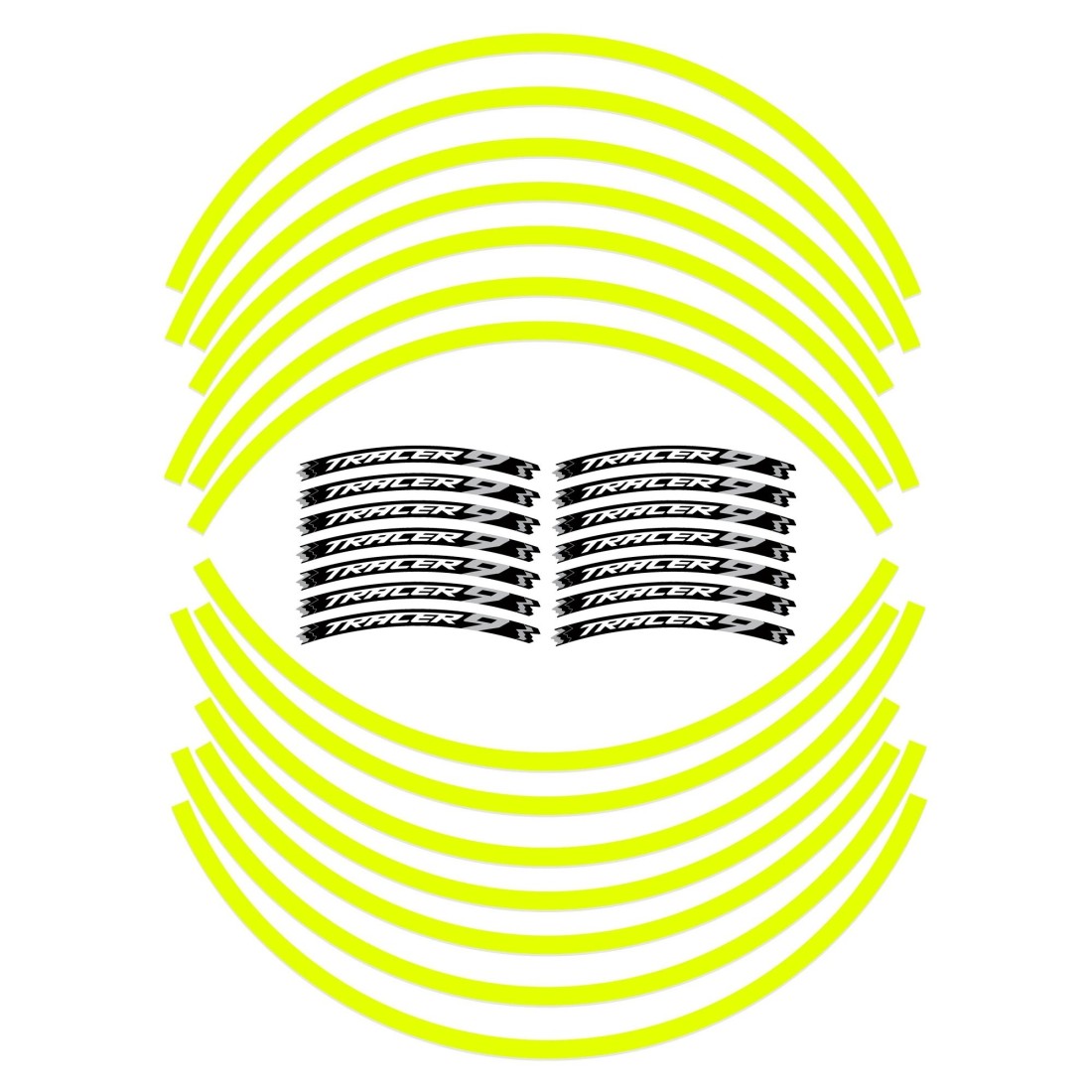 Adhesivos para perfil de rueda de moto Yamaha Tracer 9 2021 - 2024 y versión GT. Kit de rayas adhesivas Exclusivo - Labelbike®. Adhesivos para ruedas de moto MADE IN ITALY. Gráficos y letras amarillo fluo. Tracer 9 a partir de 2021. Decora y mejora el aspecto de tu Tracer 9 y GT (2021 - 24) Yamaha, resistentes al lavado, a la intemperie y a los rayos UV.