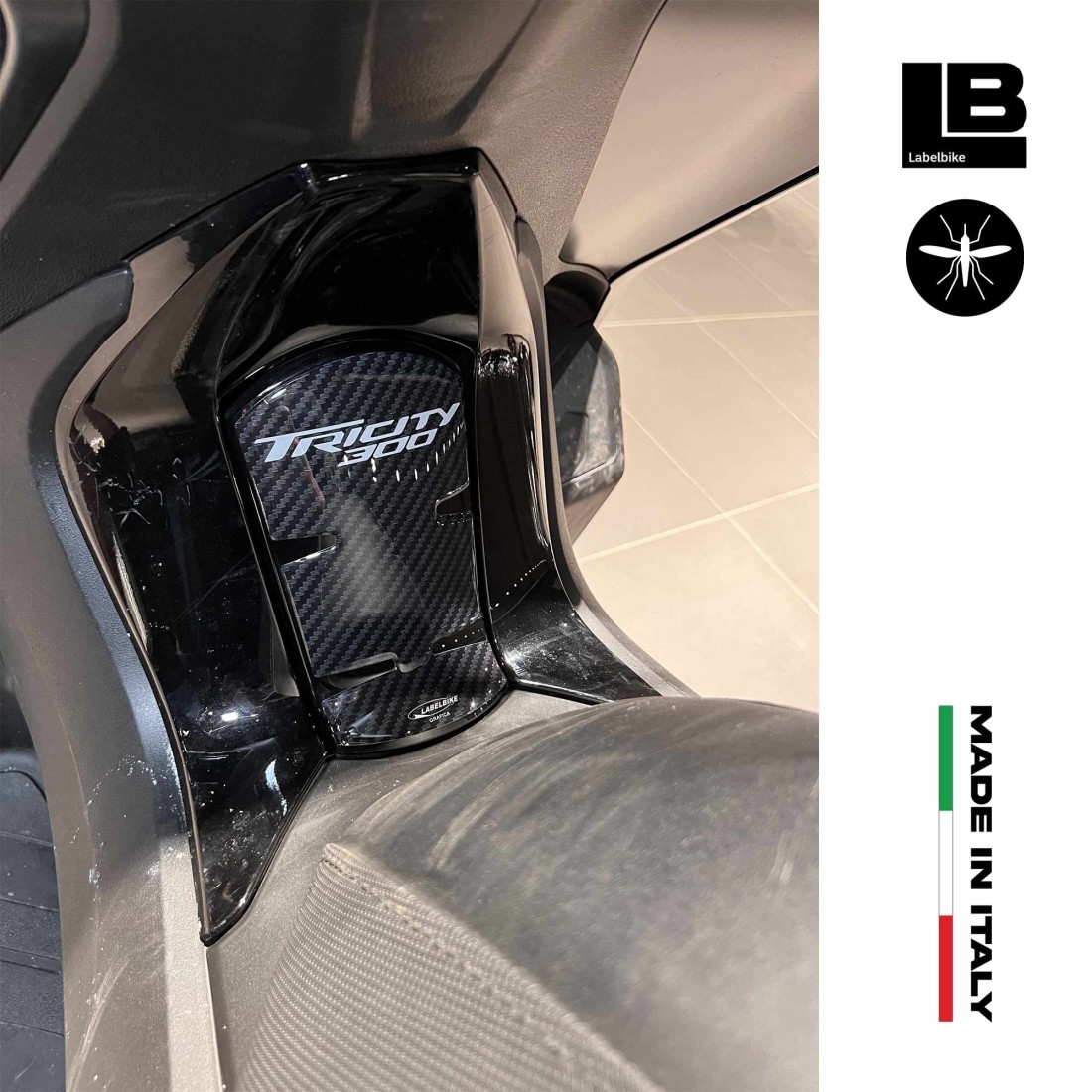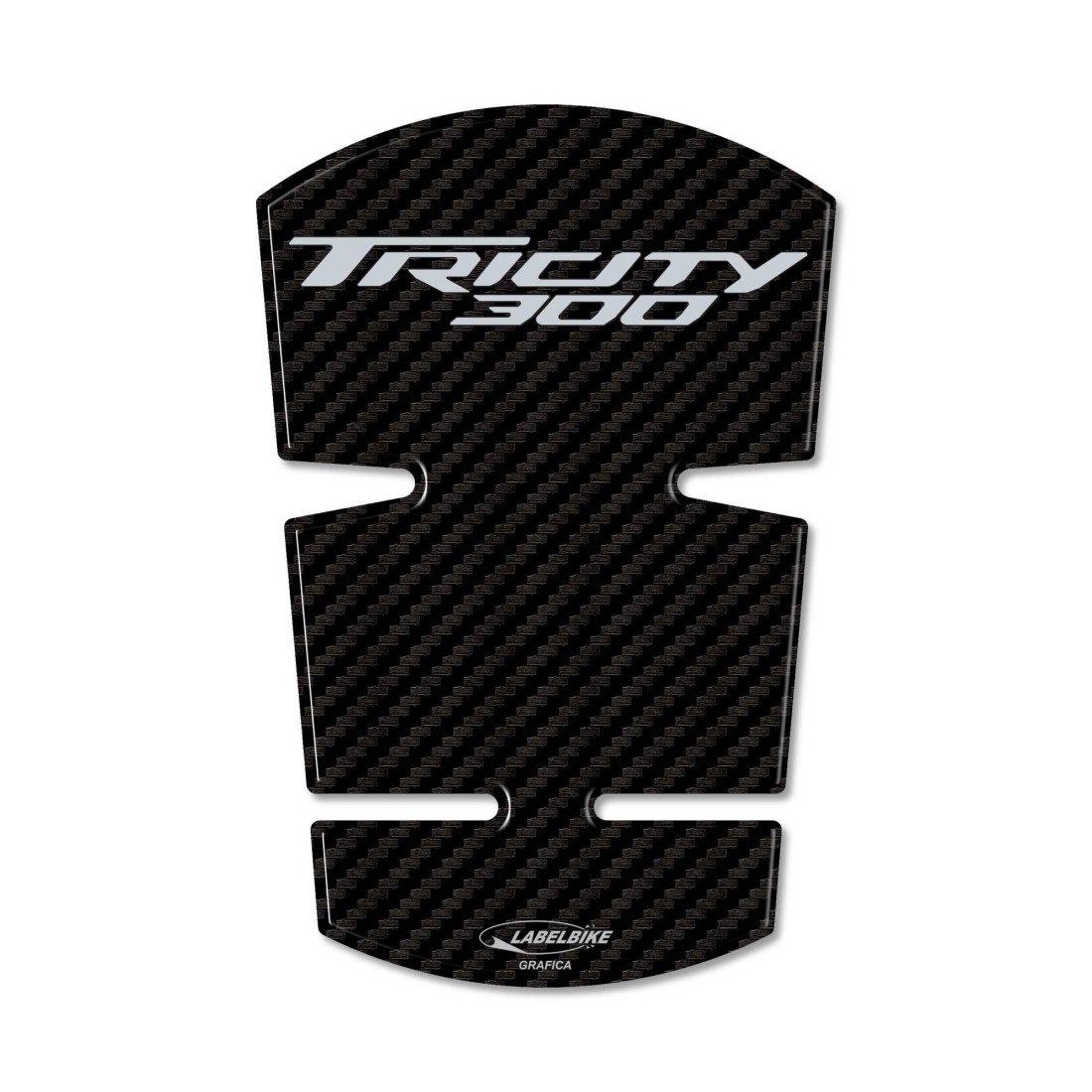 Protección adhesiva para la zona central de la puerta del depósito. Gráficos con base Simil Carbon con letras Tricity 300 gris. Pegatinas de resina efecto 3D, Exclusivo Labelbike® MADE IN ITALY.