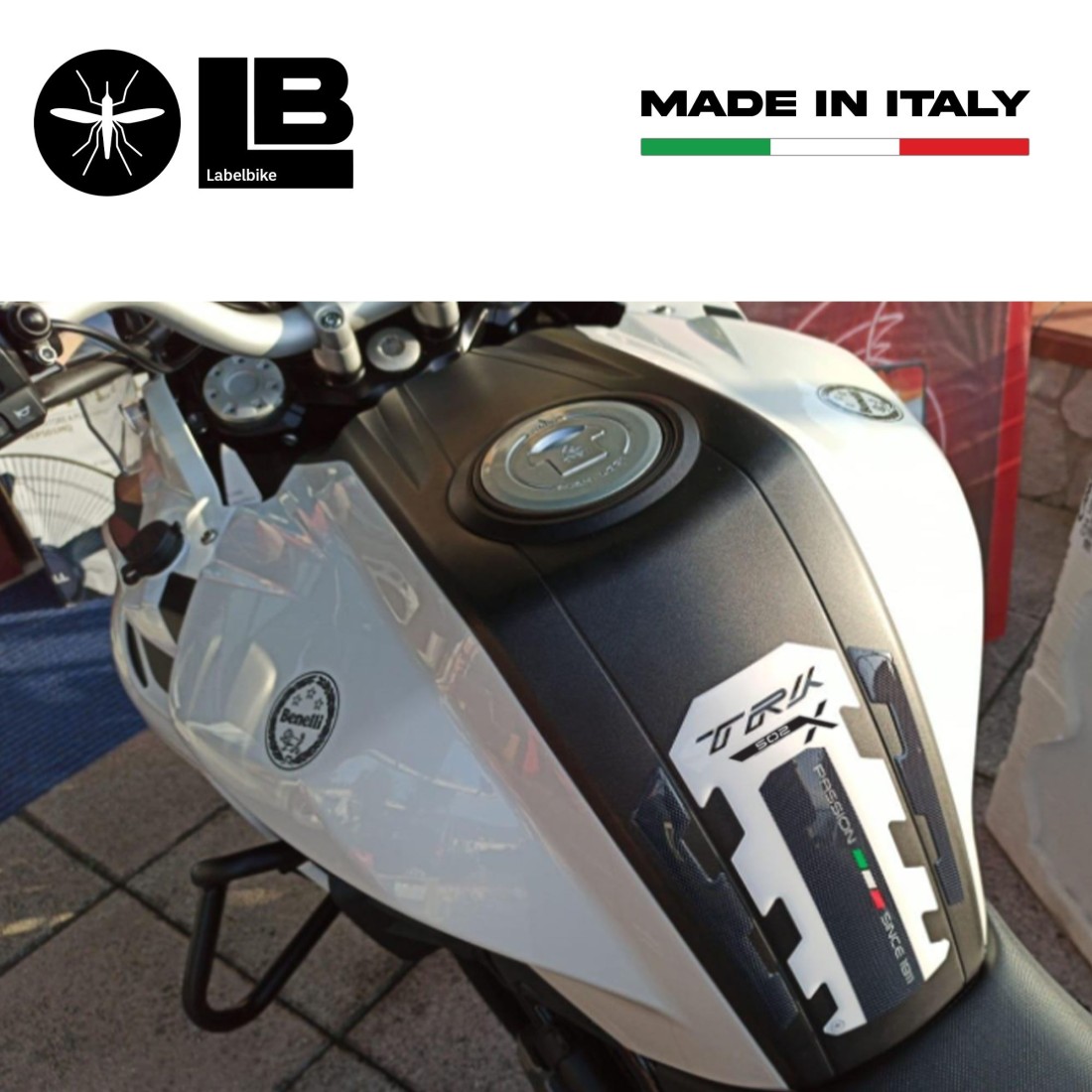 Protector de depósito Made in Italy, exclusivo Labelbike, realizado en resina conCarbon Look Blanco y letras TRK 502 X en negro. Nuestros adhesivos decoran y hacen única tu Benelli TRK 502X, compatible con todas las épocas de la moto, protege de golpes y arañazos y resiste a la intemperie y los rayos UV.