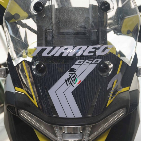 Pegatinas de resina para zona carenado delantero moto Aprilia Tuareg 660 2022-25. Pegatinas de resina de gel 3D Exclusivo - Labelbike®. Pegatinas carenado delantero HECHO EN ITALIA realizados en resina con efecto 3D. Gráficos en color Antislip Look y Amarillo o Antislip Look y Rojo con letras TUAREG.