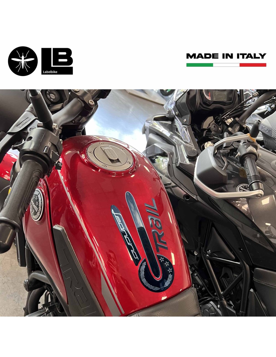 Protector de depósito de gel de resina 3D efecto metálico con gráficos en negro y plata y letras Trail resinadas. Protector de depósito de resina 3D adhesivo compatible con el depósito de moto Benelli Leoncino 500 Trail de 2017 a 2025.