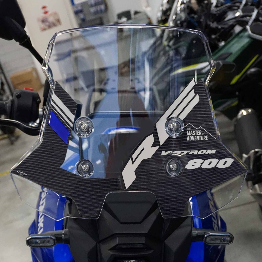 Adhesivo para parabrisas de moto fabricado en resina con efecto 3D. Protección adhesiva de resina con gráficos en Azul, Verde o Gris y letras V-Strom 800RE.
