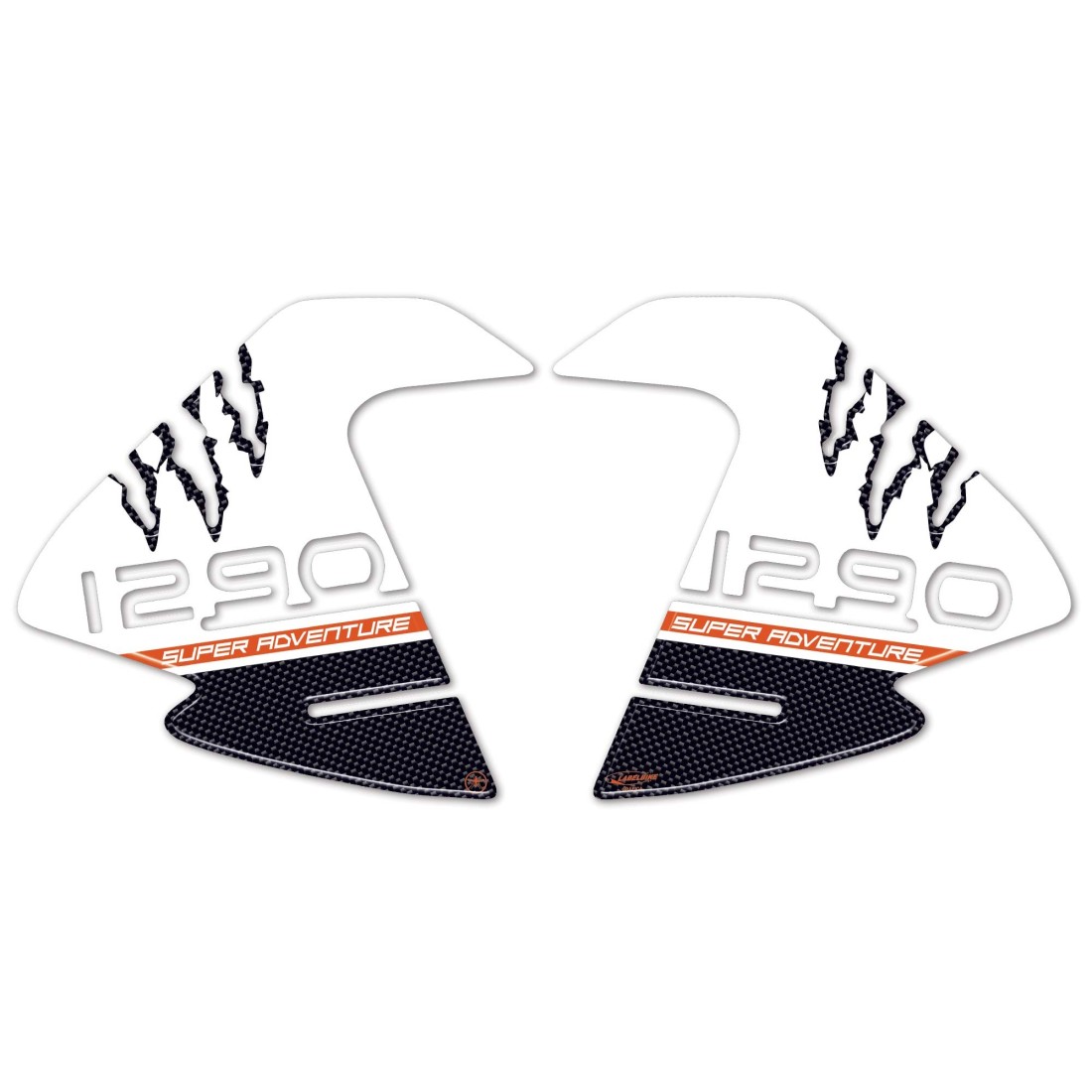 2 3D RESIN SCRATCHPROOF ADHESIVE compatible for KTM 1290 SUPER ADVENTURE SIDE PROTECTION FOR TANK Les Tank Stickers que vous êtes sur le point d'acheter sont blancs, en imitation carbone, avec le lettrage Super Adventure blanc sur fond orange et le lettrage 1290 en bas-relief.