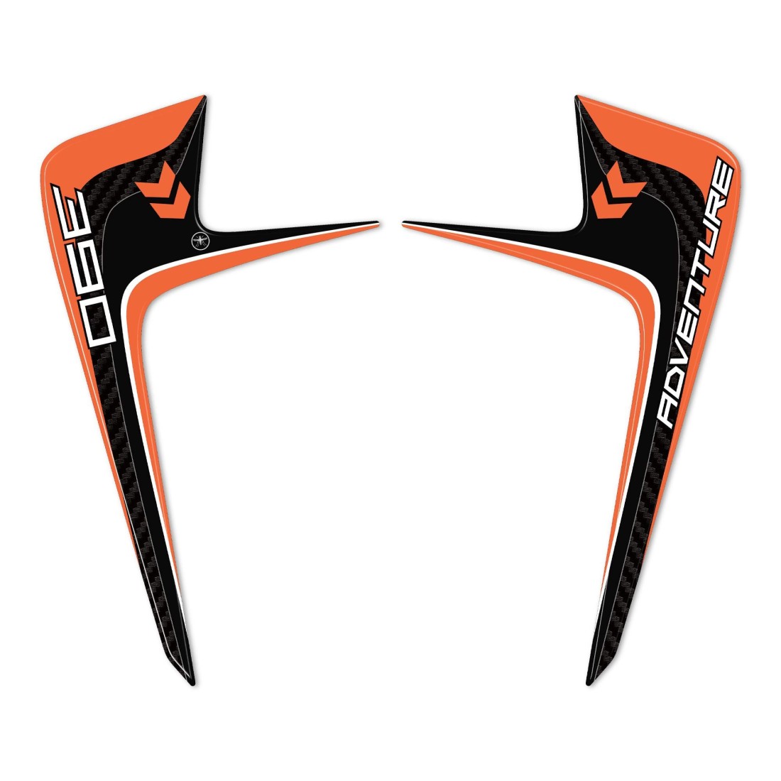 Protection adhésive 3D compatible avec l'embout de nez de la l'embout de nez de la moto KTM 390 Adventure. Kit d'autocollants en résine pour protéger et décorer votre 390 Adventure. Protections adhésives pour le nez avant gauche et droit de la moto, en résine avec graphisme orange, effet carbone et lettrage 390 Adventure.