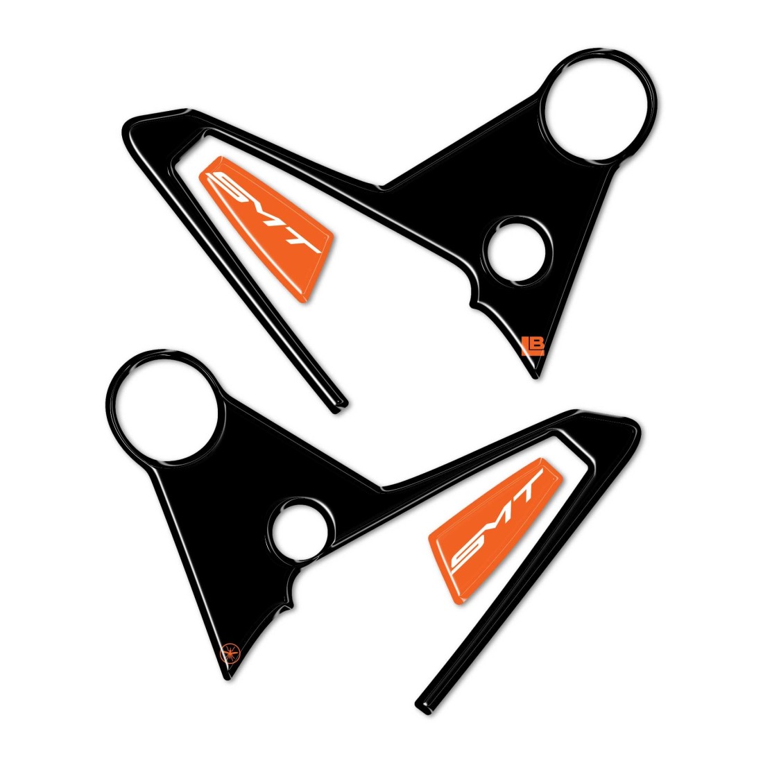 Autocollants en résine 3D pour la protection des talons au niveau des repose-pieds. Paire pour gauche et droite Protections adhésives en résine avec base graphique noire et lettrage SMT sur fond orange.