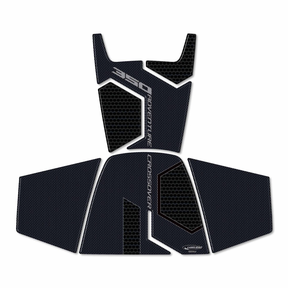 Protection adhésive complète pour la zone centrale de la clé de contact. Graphiques avec base Simil Antiskid et effet carbone avec lettrage gris Adventure Crossover 350. Autocollants en résine à effet 3D, Exclusivité Labelbike® MADE IN ITALY.