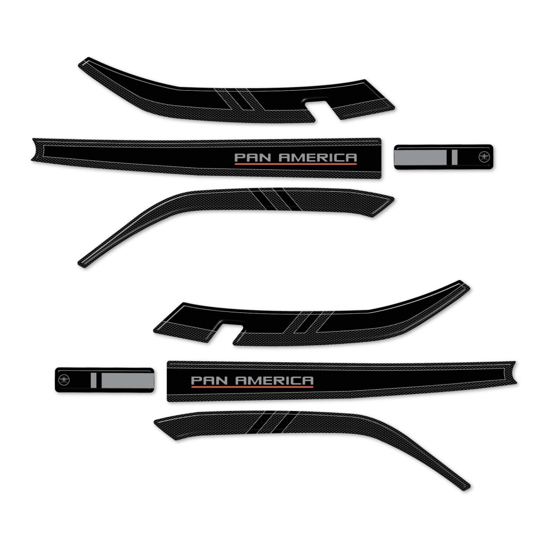 Autocollants en résine à effet 3D pour garde-mains de moto. Paire pour droite et gauche de protections en résine adhésive avec graphisme noir Carbon Look (effet carbone) et lettrage Pan America.