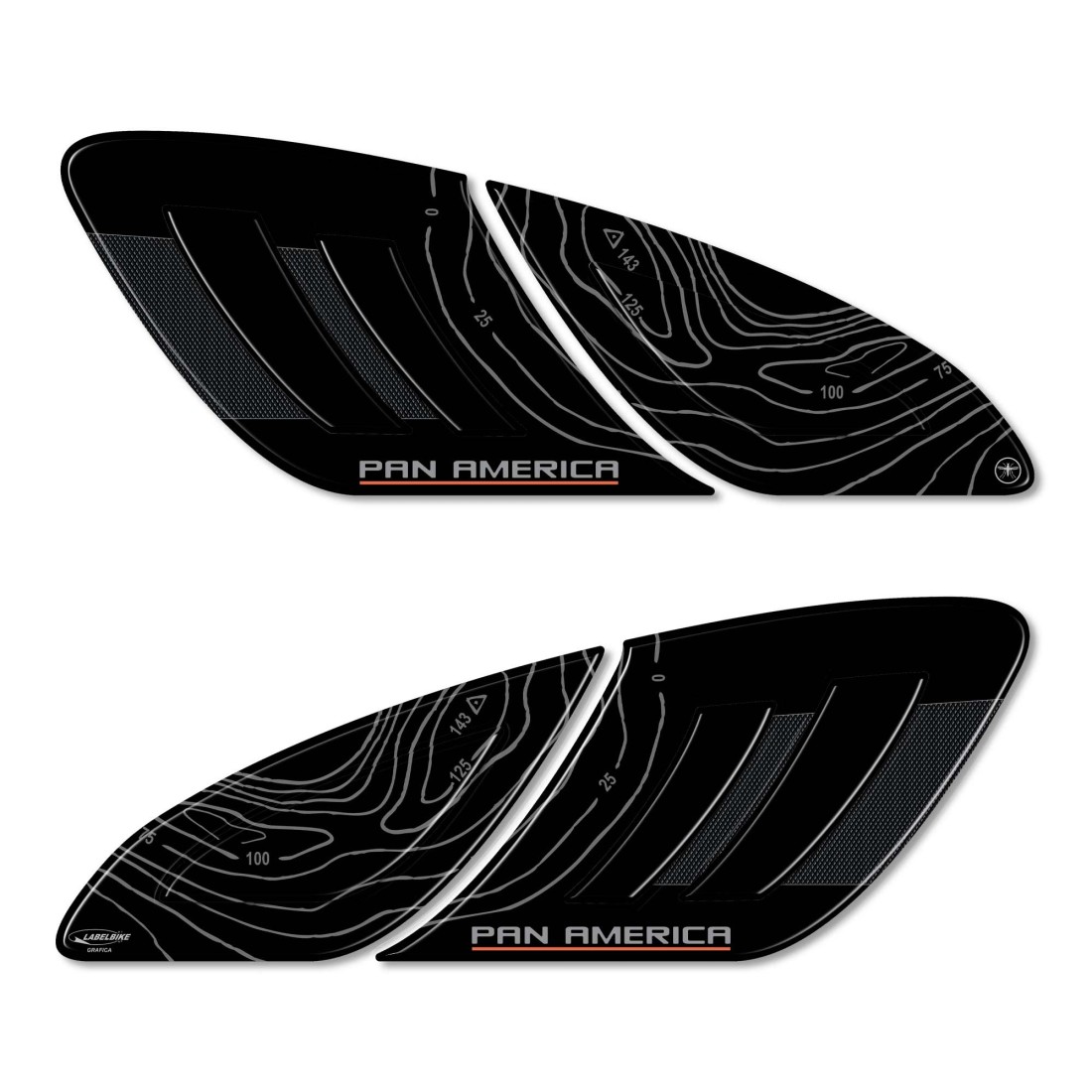 Autocollants pour réservoir de moto en résine avec effet 3D. Paire pour gauche et droite de protections adhésives en résine avec graphismes en noir, lettrage Pan America et détails colorés de la moto.
