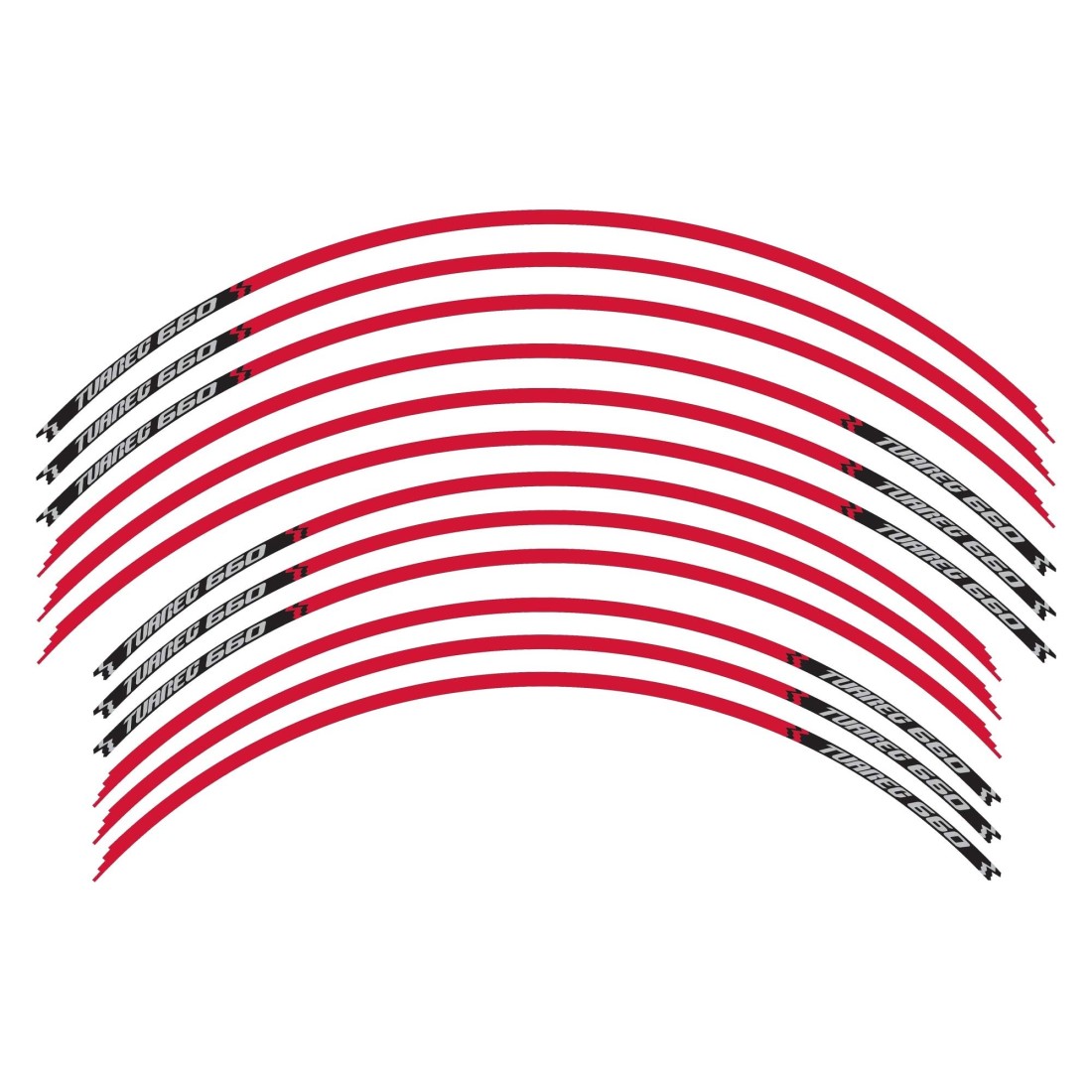 Autocollants pré-courbés pour profils de roues de moto, idéaux pour décorer et rendre votre moto unique ! Autocollants avec surface mate en jaune et noir ou rouge et noir, compatibles avec les couleurs Tuareg 660.