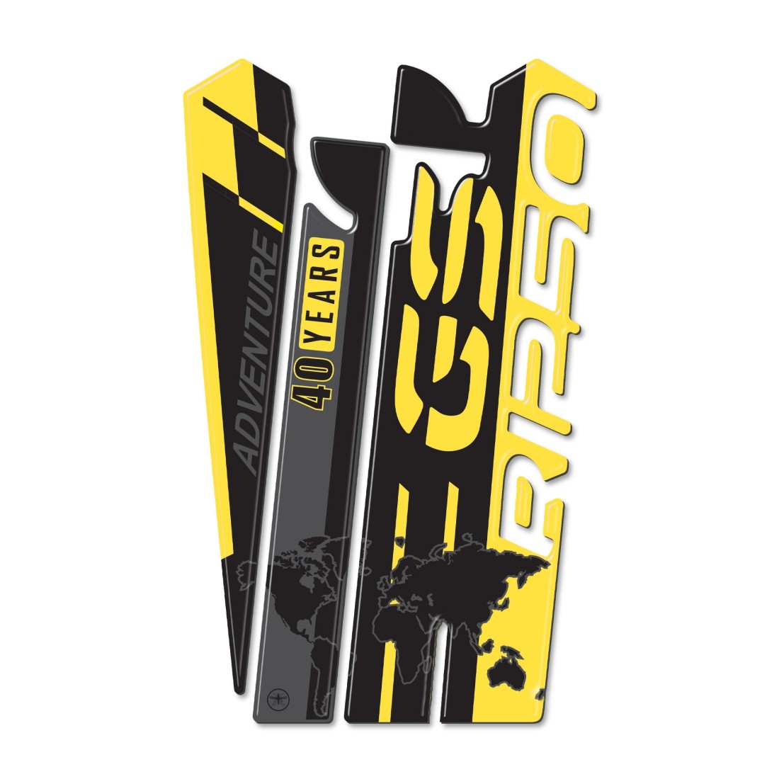 Protections adhésives 3D compatibles avec moto Bmw R 1250 GS Adventure - Edition 40 ans GS (2021-2022). Résine adhésive pour protéger et décorer le réservoir de votre GS 40e anniversaire. Graphisme de l'autocollant moto enduit de résine Effet 3DSurface brillante, pour les modèles de réservoir de moto "40 ans" à partir de 2021 .