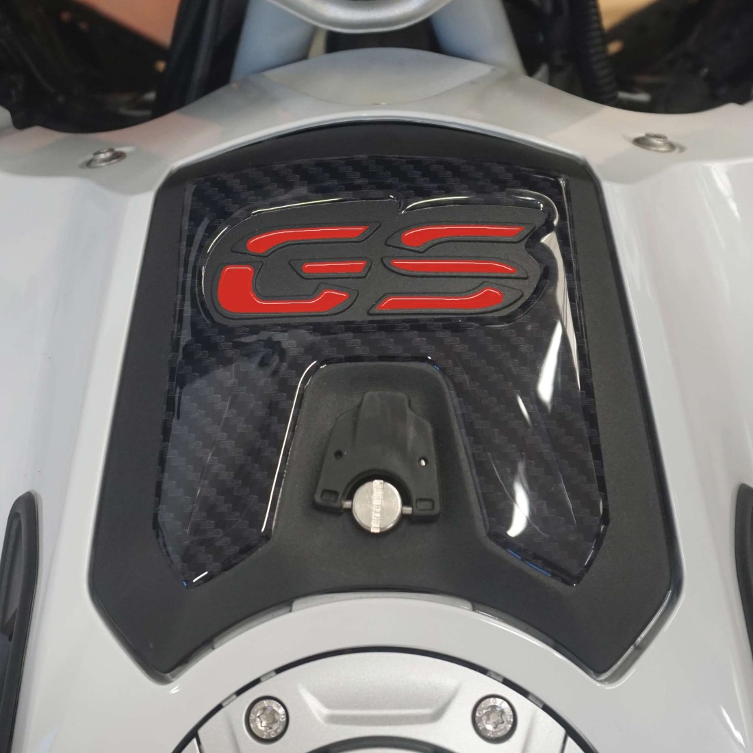 Sticker de protection adhésif 3D compatible avec BMW ADVENTURE R 1250 GS 2019 - 2024. Adhésif en résine pour protéger et décorer la trappe de réservoir de votre moto. Autocollants en résine avec baseCarbon Look et lettrage GS en 6 variations de couleurs : blanc, bleu cyan, bleu Trophy, jaune, noir et rouge. Effet 3Dsurface brillante, pour VERSION AVANT UNIQUEMENT BMW R1250GS.