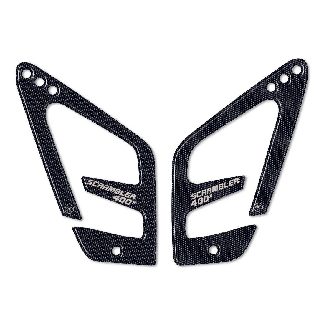 Autocollants de protection de talon en résine avec effet 3D sur matière métallique. Paire pour gauche et droite de protections adhésives en résine avec graphisme Carbon Look (effet carbone) et lettrage Scrambler 400 X.