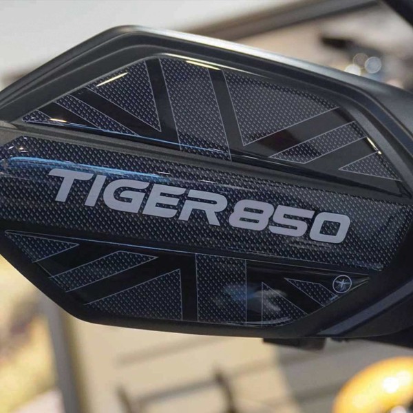Protections de garde-mains adhésives en résine pour Triumph Tiger 850 Sport 2021-2025. Deux autocollants en gel de résine 3D Exclusif - Labelbike®. Autocollants 3D gauche et droite pour Tiger 850 2021 - 2025, FABRIQUÉ EN ITALIE, en résine avec effet 3D. Graphiques avec base Black et Carbon Look (effet carbone) et lettrage gris. Pour la route, Tiger 850.