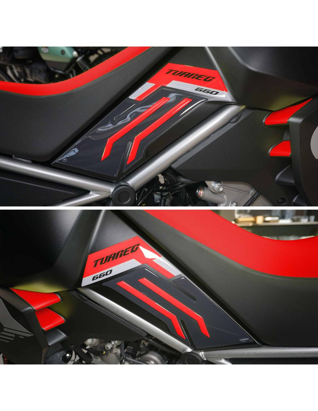 Protections en résine adhésive pour la zone latérale du réservoir de la moto Aprilia Tuareg 660 2022-25. Deux autocollants en gel de résine 3D Exclusif - Labelbike®. Autocollants pour le côté du réservoir MADE IN ITALY en résine avec effet 3D. Graphiques en couleur Antislip Look et Jaune ou Antislip Look et Rouge avec lettrage TUAREG.