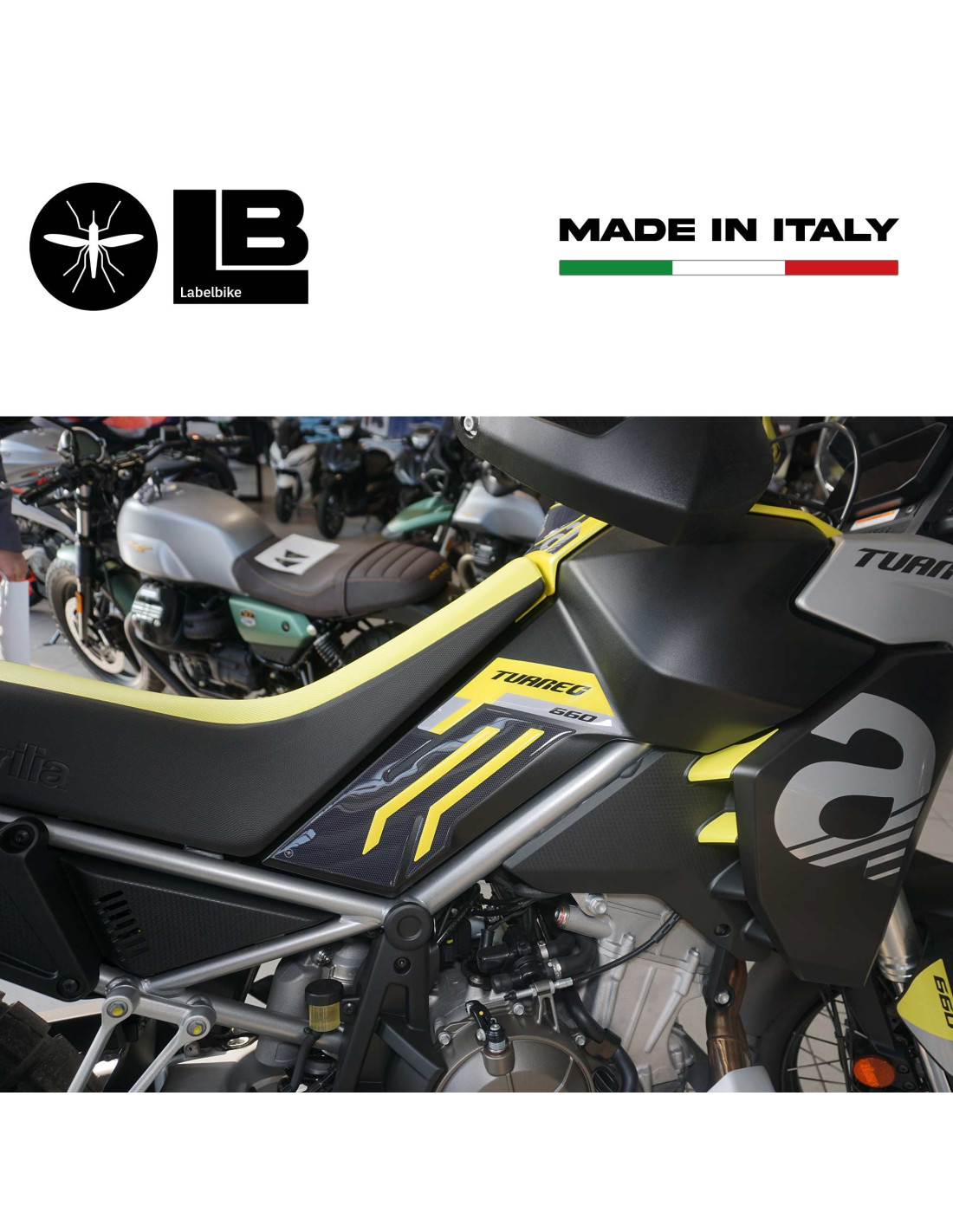 Protections en résine adhésive pour la zone latérale du réservoir de la moto Aprilia Tuareg 660 2022-25. Deux autocollants en gel de résine 3D Exclusif - Labelbike®. Autocollants pour le côté du réservoir MADE IN ITALY en résine avec effet 3D. Graphiques en couleur Antislip Look et Jaune ou Antislip Look et Rouge avec lettrage TUAREG.