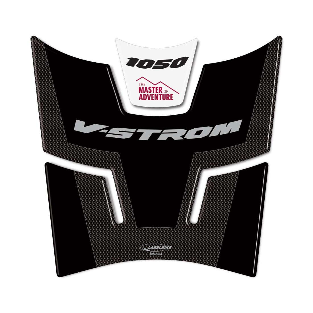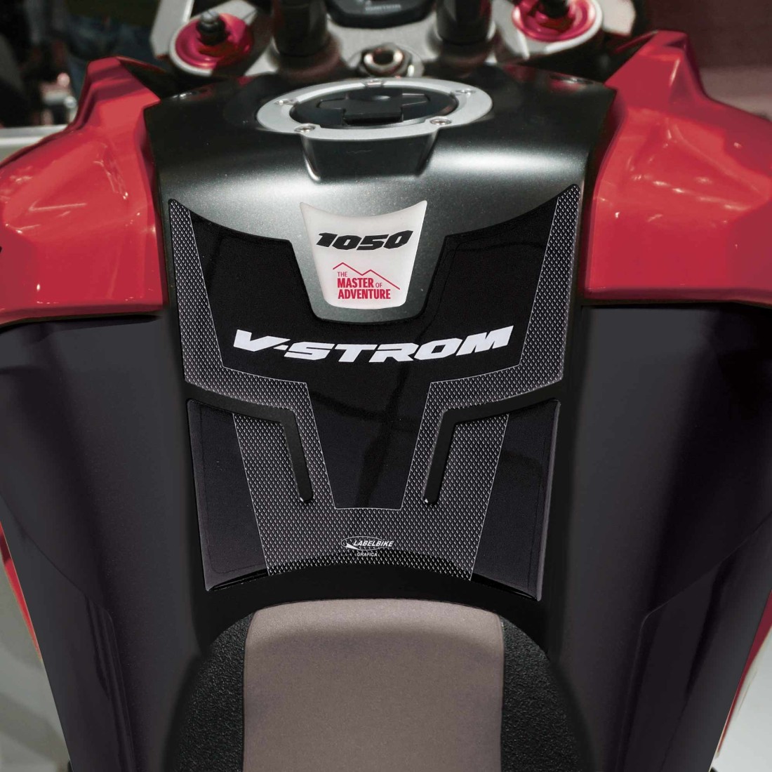 Protecteur de réservoir en résine adhésive pour moto Suzuki V-Strom 1050. Graphique avec base antidérapante noire et similaire avec finition grise ou blanche et rouge.