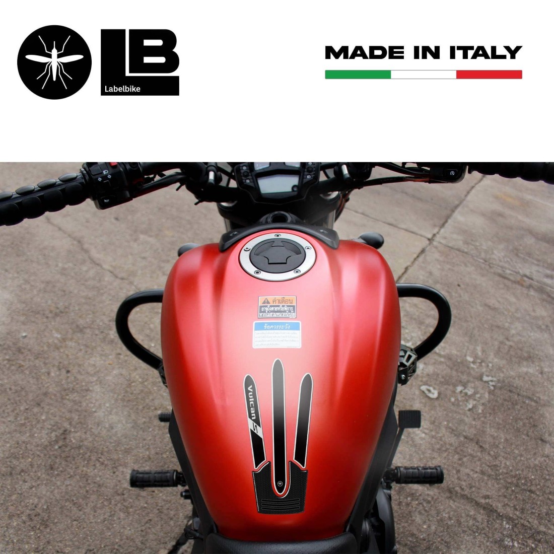 Protection de réservoir Made in Italy, Exclusive Labelbike, en matériau métallisé avec graphisme de base noir etCarbon Look et lettrage Vulcan S argenté.