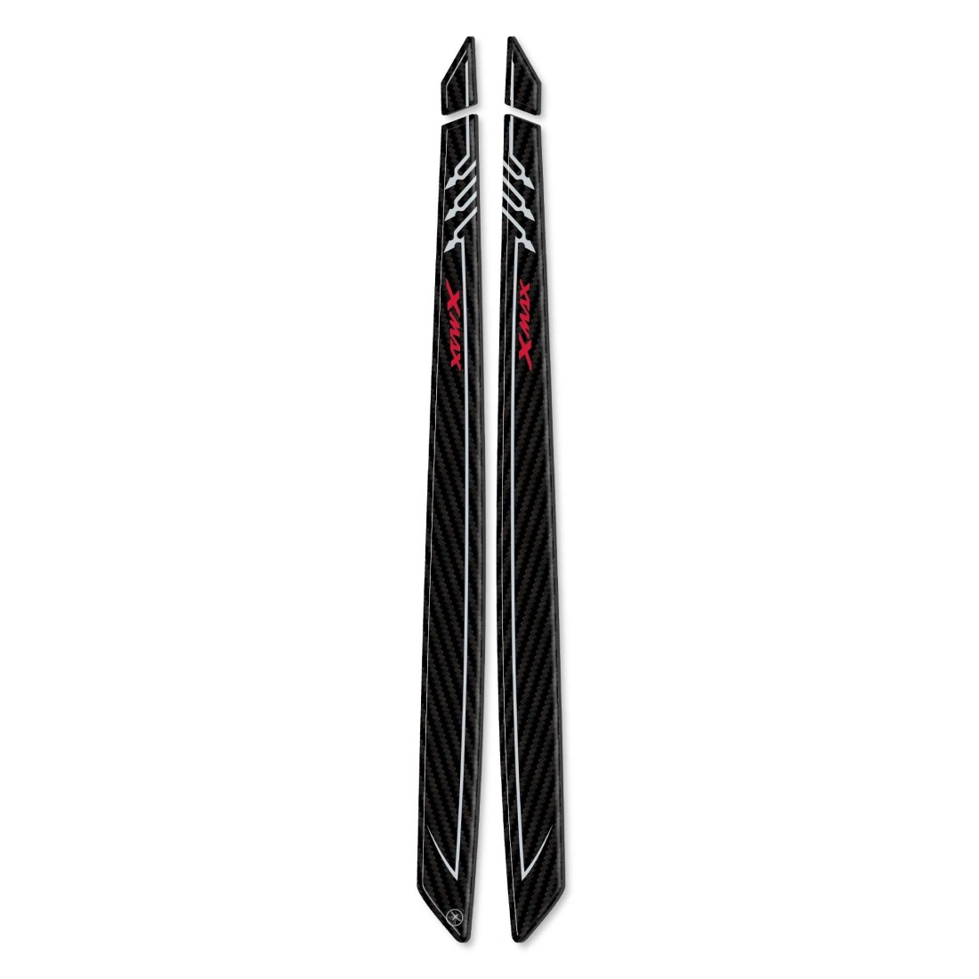 Autocollants pour poignée passager en résine avec effet 3D. Paire pour gauche et droite de protections adhésives en résine avec graphisme Carbon Look (effet carbone) et lettrage Xmax en rouge.