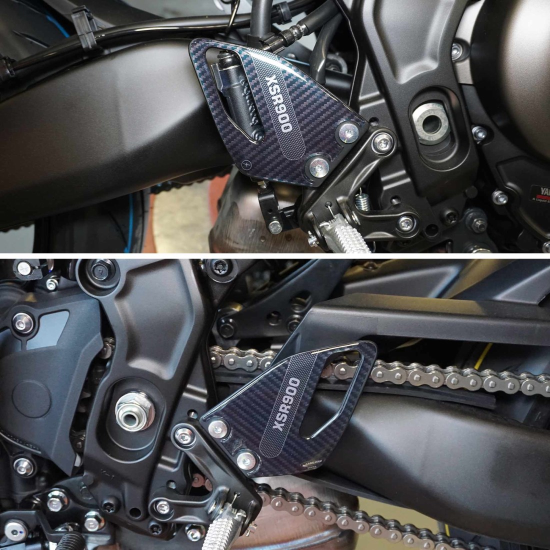 Autocollants de protection de talon en résine avec effet 3D. Paire pour gauche et droite Protections adhésives en résine avec graphisme Carbon Look (effet carbone) et lettrage XSR900 en gris.