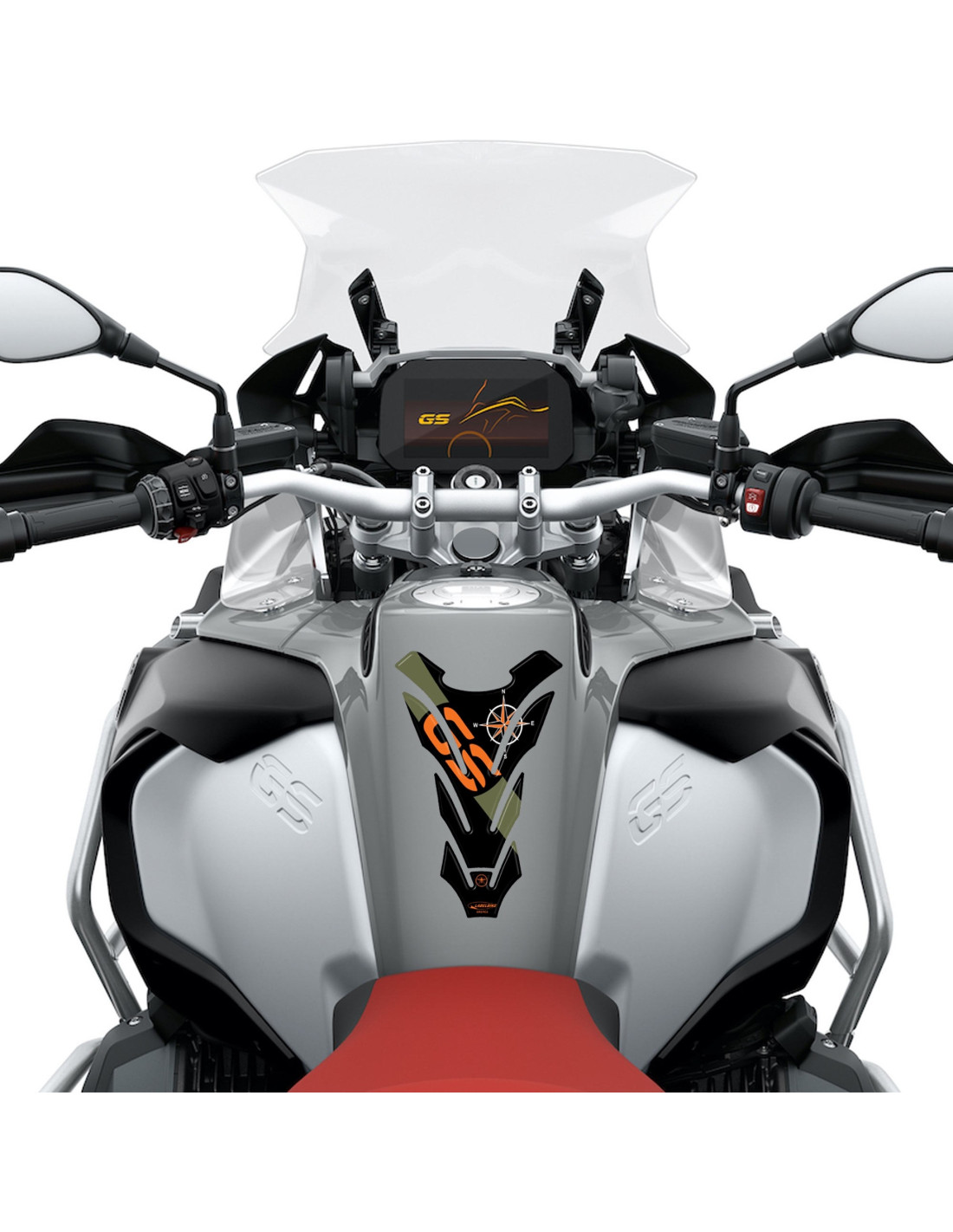 Autocollant de protection de réservoir en résine gel 3D pour réservoir de moto compatible avec BMW GS. Exclusivité Labelbike, Made in Italy. Protection de réservoir en résine 3D pour réservoir de moto BMW GS. Graphique avec bande vert militaire et inscription GS en orange.