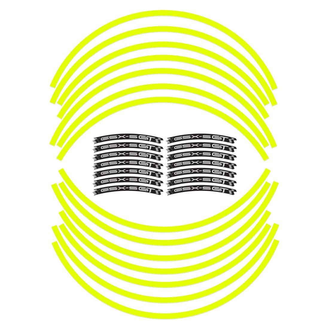 Bandes adhésives pour profil de roue Suzuki GSX-S 1000 GT à partir de 2021 avec roues de 17". Kit de bandes adhésives Exclusif - Labelbike®. Autocollants pour roues de moto MADE IN ITALY. Graphisme et lettrage jaune fluorescent GSX-S GT. Ils décorent et rehaussent le look de votre GSXS. de votre GSXS, résistants au lavage, aux intempéries et aux rayons UV.
