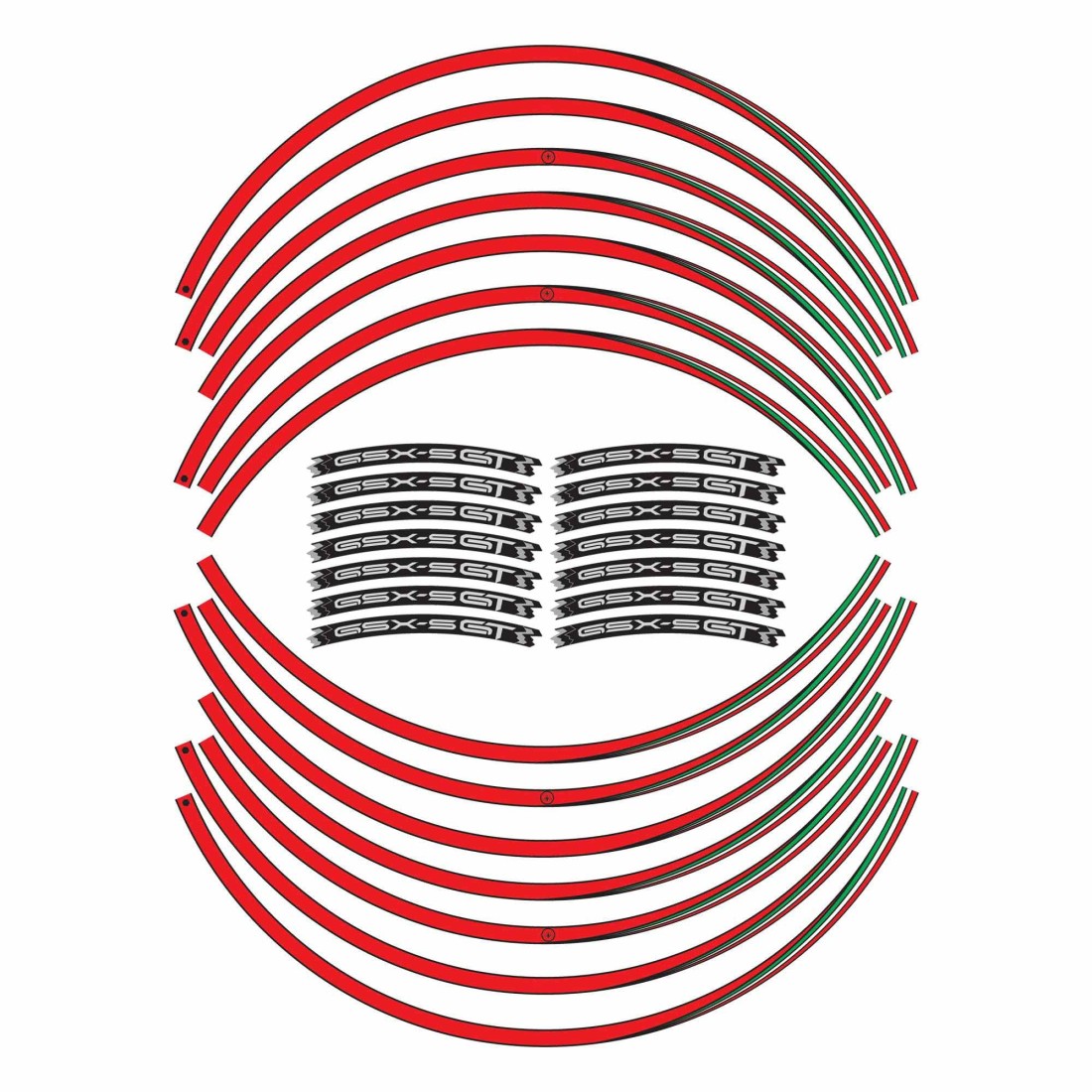 Kit d'autocollants pour les deux roues de moto, différentes couleurs disponibles (Blanc, Noir, Vert, Rouge) compatible avec le profil de roue Suzuki GSX-S 1000GT de 2021-2025