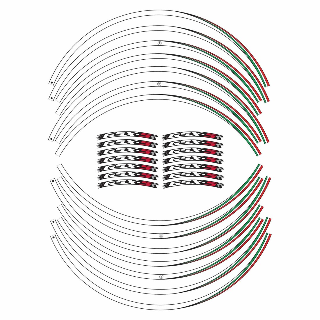 Kit d'autocollants pour les deux roues de moto, différentes couleurs disponibles (Blanc, Noir, Vert, Rouge) compatible avec le profil de roue Suzuki GSX-S 750 et GSX-S 1000 2016-2020.