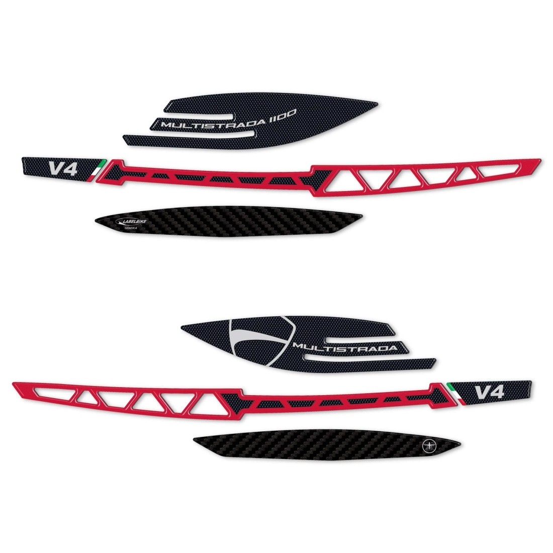 Stickers adhésifs en résine pour Ducati Multistrada V4 2021. Autocollants 3D en résine gélifiée Exclusif - Labelbike®. Autocollants de protection pour garde-mains MADE IN ITALY Réalisé en résine avec effet 3D. Graphiques avec base Black, Red et Carbon Look (effet carbone) et écriture. Multistrada 1100 V4.
