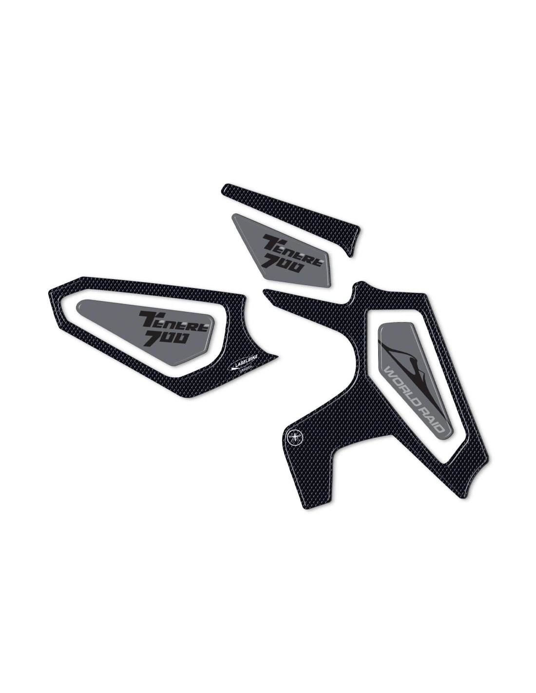 Jeu d'autocollants avec base noire et Simil Antislip avec finition Gris ou Bleu clair pour les couleurs 2022. Fabriqué en résine 3D compatible avec les talonnettes de moto. Yamaha Tenere 2022.
