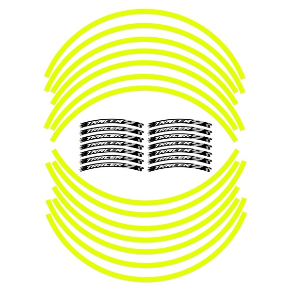 Autocollants pour profil de roue de moto Yamaha Tracer 9 2021 - 2024 et version GT. Kit de bandes adhésives Exclusif - Labelbike®. Autocollants pour roues de moto MADE IN ITALY. Graphisme et lettrage jaune fluo Tracer 9 à partir de 2021. Décorez et améliorez le look de votre de votre Tracer 9 et GT (2021 - 24) Yamaha, résistant au lavage, aux intempéries et aux rayons UV.