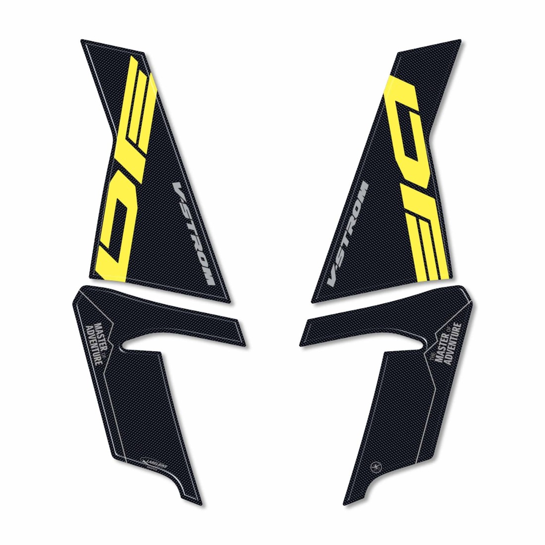 Autocollants pour la zone latérale du garde-boue de moto en résine avec effet 3D. Paire pour gauche et droite de protections adhésives en résine avec graphisme en jaune ou gris et lettrage V-Strom DE.