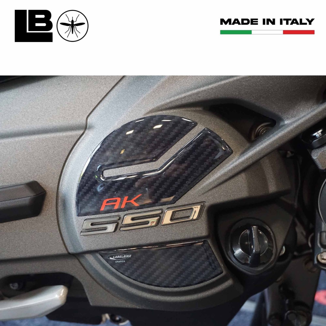 Adhesive protectors for crankcase area Kymco Ak550 Premium from 2023. Graphics with carbon effect base and Ak lettering in red. Resin 3D effect stickers, Exclusive Labelbike MADE IN ITALY.