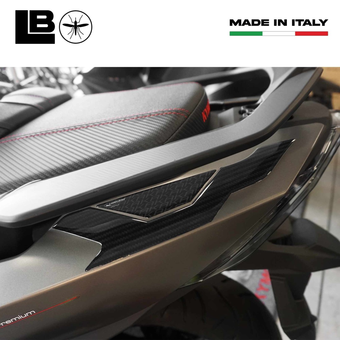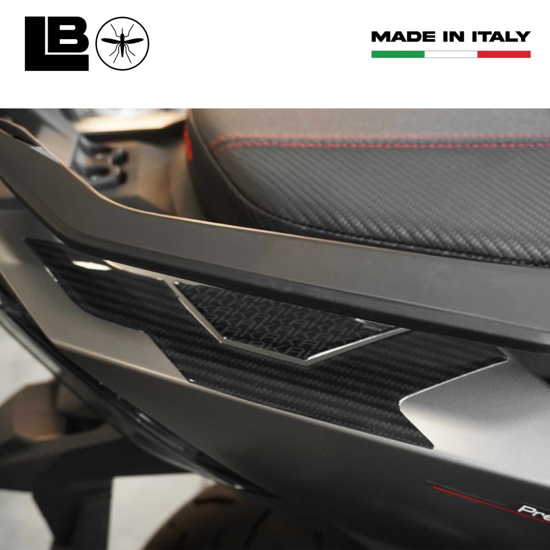 Adhesive protectors for under passenger handles Kymco Ak550 Premium from 2023. Graphics with carbon effect base. 3D Resin Stickers, Exclusive Labelbike MADE IN ITALY.