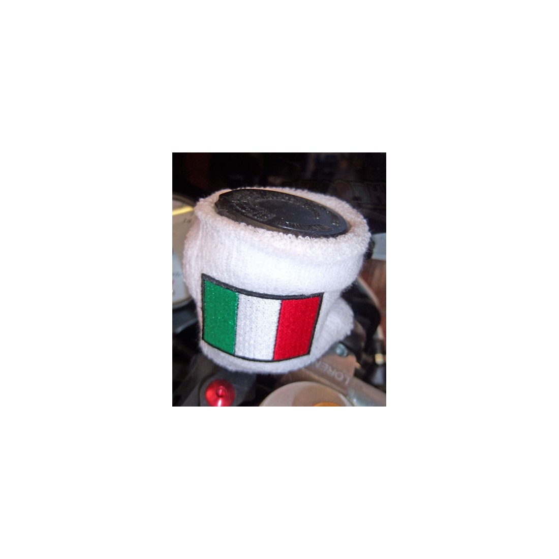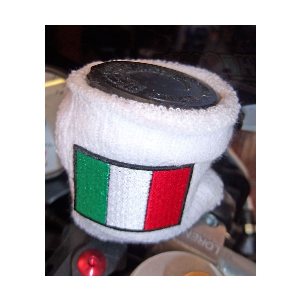 BRAKE OIL TANK COVER POLSINO MOTO - UNIVERSAL WHITE with embroidered ITALIAN FLAG logo PERFECTLY FITS THE TANK EASY TO FIT THE BRAKE TANK COVER POLSINO, besides making the bike more aesthetically beautiful, also has the task of absorbing any small leaks of fluid that could damage the metal parts of your bike ....The wristband can be washed with neutral soap to make it like new again. Made of soft sponge, it can also be worn as a simple wristband.