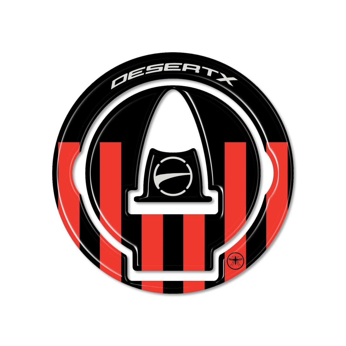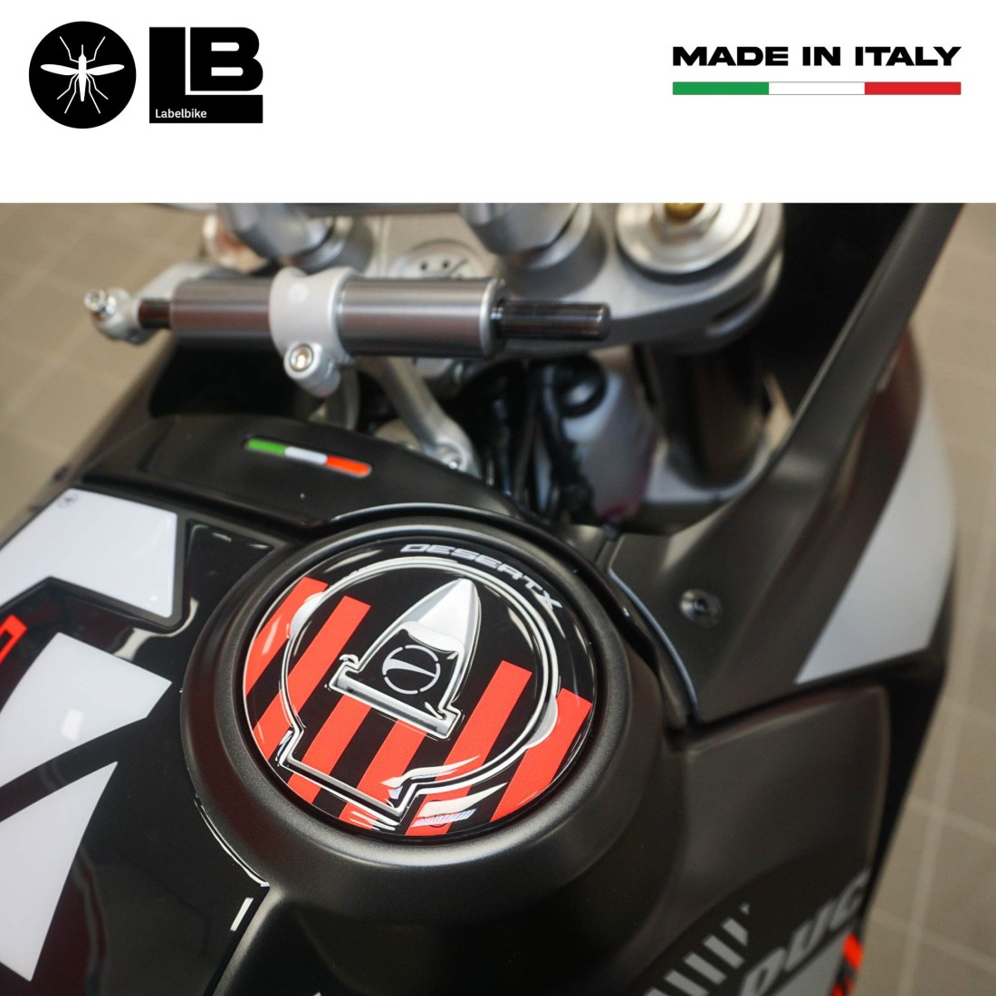 Motorbike sticker for fuel filler cap made in resin with 3D effect. Resin adhesive protection with graphics dedicated to the new Ducati DesertX RR22 2023-2025 colouring.