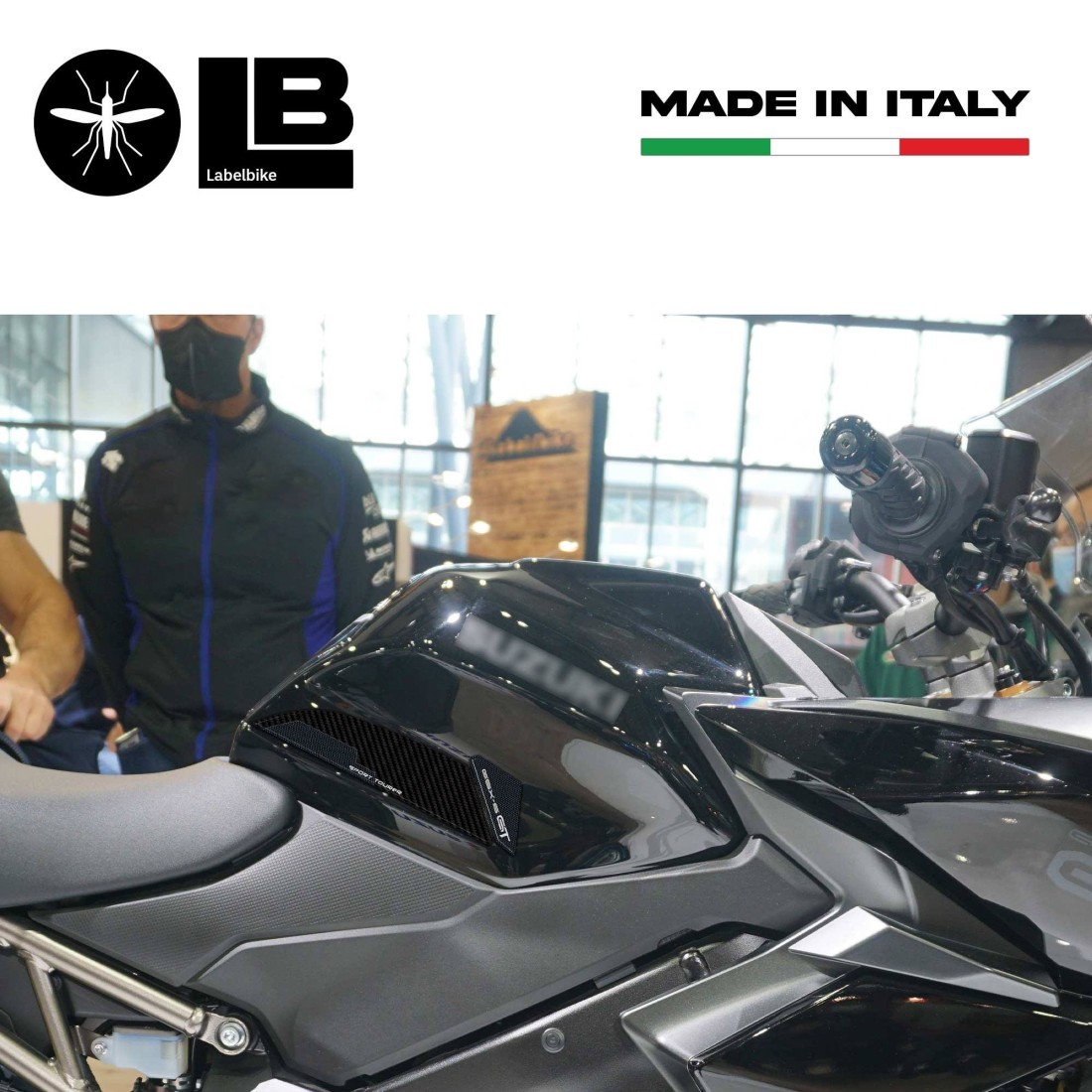 Resin adhesive protectors for side tank area Suzuki GSX-S 1000 GT motorbike from 2021. Two 3D gel resin stickers Exclusive - Labelbike®. Tank side stickers MADE IN ITALY made in resin with 3D effect. Graphics in Carbon Look and Black colour with lettering GSX-S Naked Aggression.