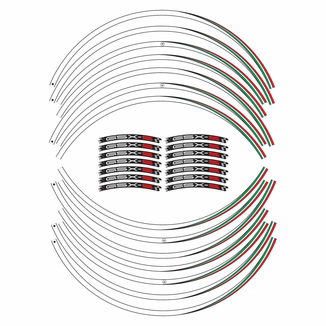 Sticker kit for both motorbike wheels, various colours available (White, Black, Green, Red) compatible with Suzuki GSX-S 950 and GSX-S 1000 wheel profile from 2021-2025