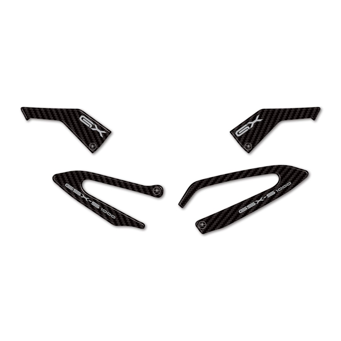 Resin heel protector stickers with 3D effect. Pair for left and right side of adhesive resin protectors with Carbon Look graphics (carbon effect) and GSX-S1000GX lettering.
