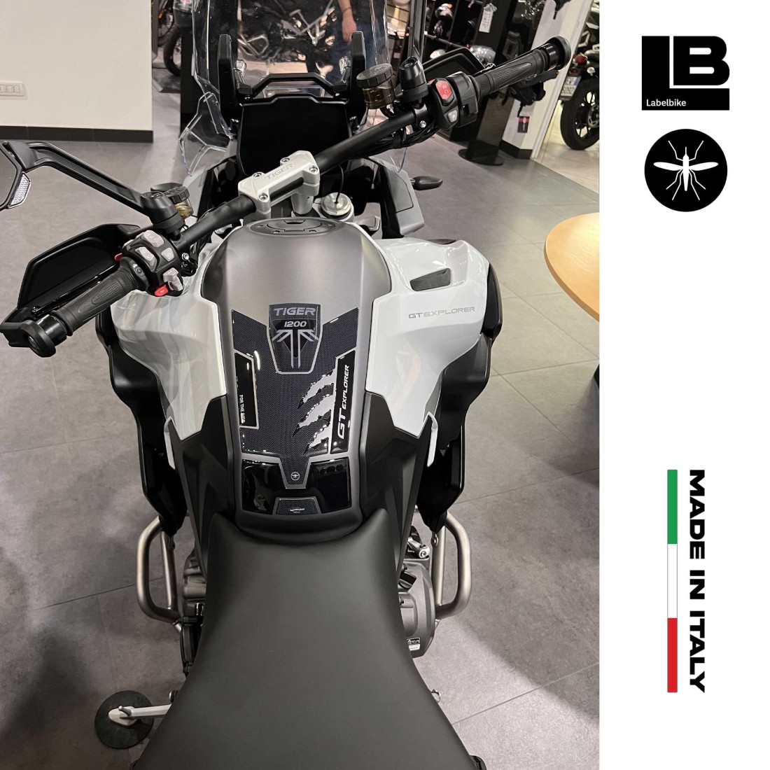 Resin stickers to protect and decorate the tank of your Triumph Tiger 1200 GT Explorer 2022 - 2023. Resin-coated motorbike graphics 3D effect, glossy surface, for lower and upper tank area Triumph Tiger 1200 GT Explorer motorbikes from 2022.