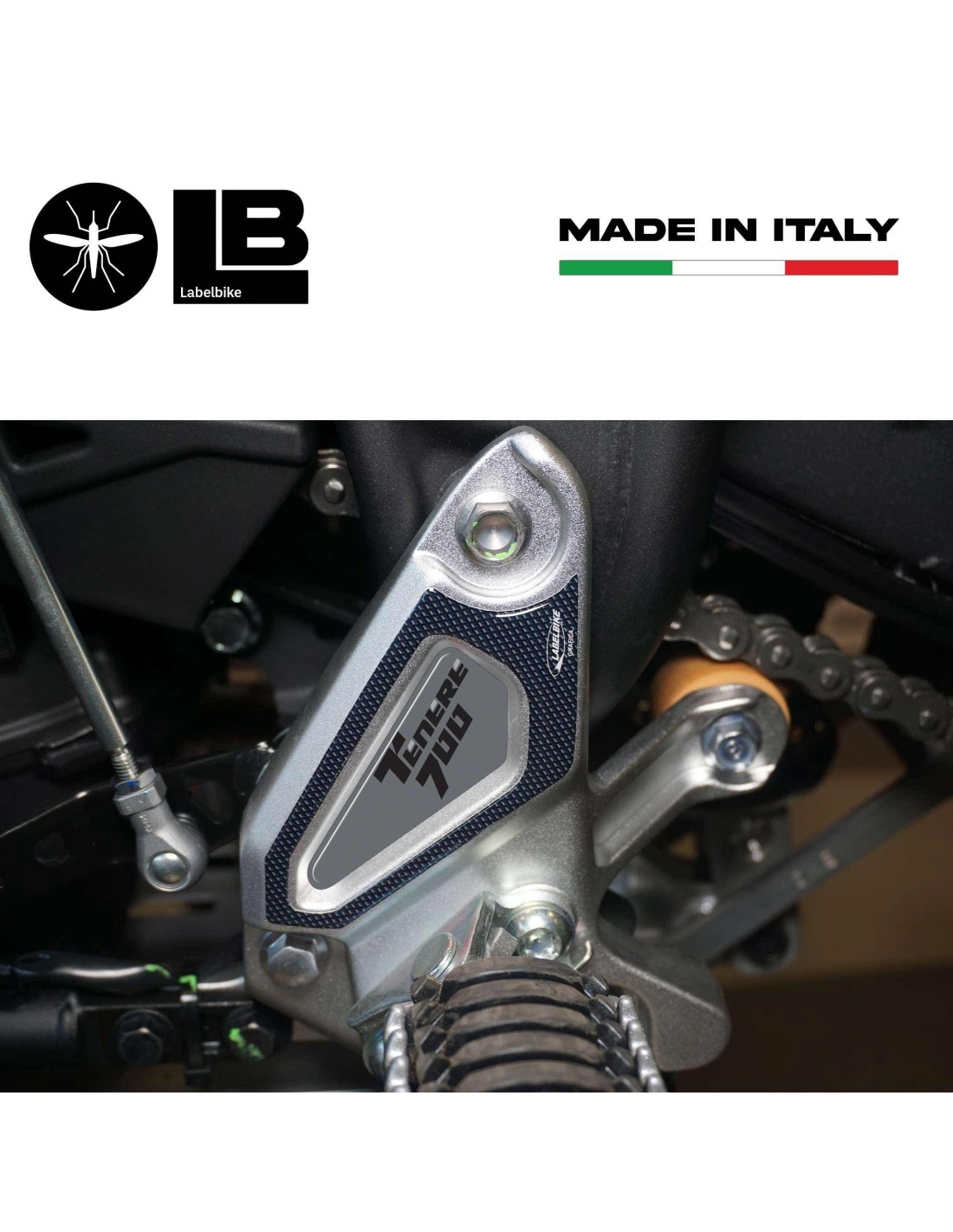 Pair of ResinAdhesive Protectors for left and right side heel guards Yamaha T7 motorbike. 3D gel resin sticker kit Labelbike® exclusive. 3D stickers for motorbike heel protectors MADE IN ITALY made of resin with 3D effect. Graphics in Carbon Look colour (carbon effect) and Black for Yamaha Tenere 700 2022 Light Blue and Grey colours.