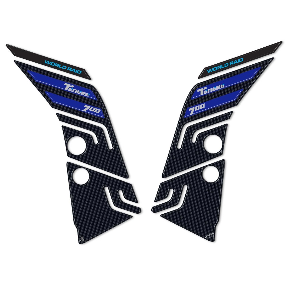 Adhesive resin protectors for side tank area Yamaha Tenere 700 motorbike from 2022. Two 3D resin gel stickers Exclusive - Labelbike®. Tank side stickers MADE IN ITALY made in resin with 3D effect. Graphics in Carbon Look and Grey or Carbon Look and Light Blue with World Raid lettering , designed for new 2022 Yamaha Tenere 700 colours .